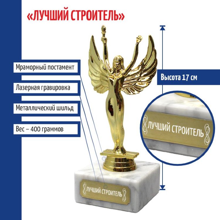 Лазерная гравировка нанесена на металлическую табличку, приклеенную к каменной подставке. Размер: 17 х 6,5 х 6,5 см. Высота фигурки: 14 см. Размер постамента: 6,5 х 6,5 х 3 см. Размер шильдика (таблички с надписью): 5 х 1,7 см. Материал: Пластик (фигурка), Мрамор (постамент). Упаковка: Белая картонная коробка. Как римская богиня Виктория символизировала победу, так и древнегреческая Ника олицетворяла триумф. Наградная статуэтка с женщиной на мраморном постаменте - символ успеха и величия. Женская фигура с грациозным обликом ангела воплощает силу и устремлённость. Она придаст неповторимую элегантность и большое значение вашему подарку. Оригинальный подарок на любой праздник или награждение. Он станет достойной памятной наградой за победы и достижения от коллектива на память. Символизирует не только личные успехи, но и благодарность за труд и преданность делу. Актуально в качестве новогоднего сюрприза жене, мужу, отцу, взрослым родственникам (папе, дедушке, маме, бабушке), коллегам (начальнику), преподавателю или юбиляру. Такой красивый сувенир подходит для множества знаковых дат и событий дома и в офисе, на юбилеи родителей, международный женский день (8 марта), 14 и 23 февраля, Новый год или день рождения (ДР). Считается хорошим корпоративным подарком как для мужчин (сыну, брату, другу, любимому парню, руководителю), так и для женщин (начальнице, дочери, сестре, подруге или девушке). Строитель - архитектор прочного фундамента, инженерных решений и городской инфраструктуры. Его работа как плотника или монтажника формирует облик будущего здания. Прораб, каменщик или инженер ценят внимание к деталям и уважение к делу, требующему точности и ответственности. Презент к сдаче объекта или ко Дню строителя (второе воскресенье августа). 1635
