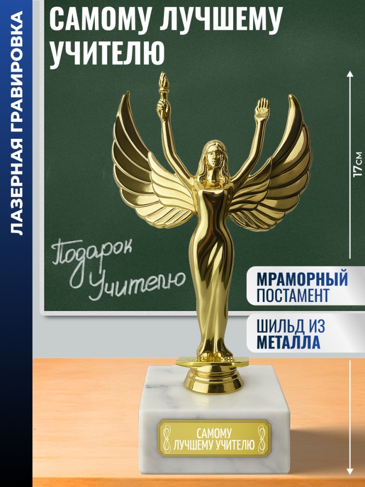 Лазерная гравировка нанесена на металлическую табличку, приклеенную к каменной подставке. Размер: 17 x 6,5 x 6,5 см. Высота фигурки: 14 см. Размер постамента: 6,5 x 6,5 x 3 см. Размер шильдика (таблички с надписью): 5 x 1,7 см. Материал: Пластик (фигурка), Мрамор (постамент). Упаковка: Белая картонная коробка. Как римская богиня Виктория символизировала победу, так и древнегреческая Ника олицетворяла триумф. Наградная статуэтка с женщиной на мраморном постаменте - символ успеха и величия. Женская фигура с грациозным обликом ангела воплощает силу и устремлённость. Она придаст неповторимую элегантность и большое значение вашему подарку. Идеальный подарок учителю любого уровня образования - от педагога начальных классов до преподавателя старшеклассников. Порадует классного руководителя, наставника и учительницу (в школе или учебном заведении). Особенный выбор для важных школьных событий: выпускной, последний звонок, 1 сентября или День учителя (5 октября). Подойдет для выражения благодарности от выпускника училища, ученика школы или целого класса и их родителей (родительский комитет). Универсальное решение для признания заслуг в образовании и обучении. Оценят как опытный педагог или репетитор с многолетним стажем, так и молодой преподаватель-наставник, работающий с младшеклассниками. Станет памятным презентом для всех, кто связан с передачей знаний и воспитанием. Поможет выразить искреннюю признательность любимой учительнице - от благодарных учеников до коллег. Красивый способ отметить вклад лучшего педагога в школьный праздник или учебный процесс техникума, в том числе и в гимназии, академии, колледже или лицее. 1635