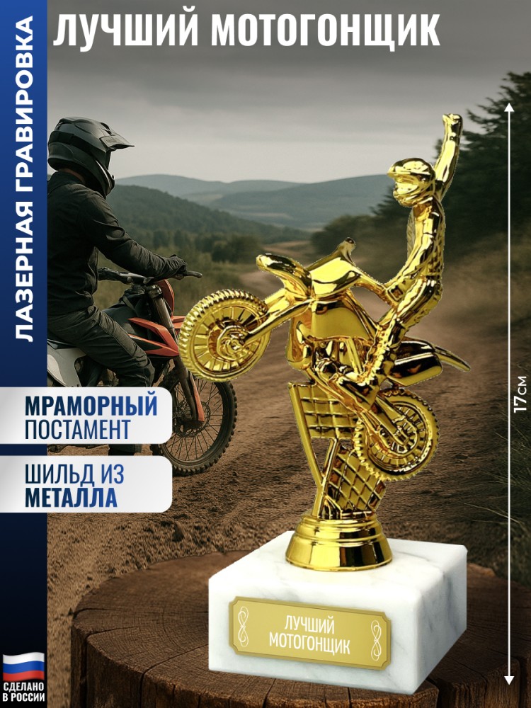 Лазерная гравировка нанесена на табличку (шильд), приклеенную к подставке. Размер: 17 x 6.5 x 6.5 см. Высота фигурки без постамента: 14 см. Размер мраморной подставки: 6.5 x 6.5 x 3 см. Размер шильдика: 5 x 1.7 см. Материалы: Пластик (фигурка), Мрамор (постамент). Вес: 370 г. Упаковка: Картонная коробка. Наградная статуэтка с фигуркой мотоциклиста предназначена для вручения участникам мотосоревнований и мероприятий, связанных с байк-культурой. Используется как трофей за достижения в мотоспорте или тематический элемент коллекции. Фигура байкера символизирует стремление к скорости, свободе и преодолению препятствий. Сувенир отражает дух приключений и подчеркивает личную преданность мотоциклам как части образа жизни. Сувенир станет отличной памятной наградой за заслуги или победы, подходит для корпоративных и личных подарков на 23 февраля, юбилей, Новый год, день рождения и другие значимые события. Оригинальный подарок для мужчин разного возраста (папе, сыну, брату) или статуса (другу, любимому парню, коллеге от коллектива). Актуально в качестве новогоднего сюрприза мужу, отцу, коллеге, начальнику или юбиляру. 1575