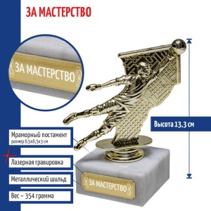 Лазерная гравировка наносится на табличку (шильд), приклеенную к подставке. Размер: 13,3 x 6,5 x 6,5 см. Высота фигурки без постамента: 10,3 см. Размер мраморного постамента: 6,5 x 6,5 x 3 см. Размер шильдика (таблички с надписью): 5 x 1,7 см. Материалы: пластик (фигурка), мрамор (постамент). Вес: 354 гр. Упаковка: картонная коробка. Наградная статуэтка с изображением вратаря и мяча - подходит для вручения участникам и призёрам футбольных турниров, лиг и матчей, а также для оформления спортивных интерьеров. Оригинальный подарок на любой праздник или награждение. Он станет достойной памятной наградой за победы и достижения от коллектива на память. Символизирует не только личные успехи, но и благодарность за труд и преданность делу. Актуально в качестве новогоднего сюрприза жене, мужу, отцу, взрослым родственникам (папе, дедушке, маме, бабушке), коллегам (начальнику), преподавателю или юбиляру. Такой красивый сувенир подходит для множества знаковых дат и событий дома и в офисе, на юбилеи родителей, международный женский день (8 марта), 14 и 23 февраля, Новый год или день рождения (ДР). Считается хорошим корпоративным подарком как для мужчин (сыну, брату, другу, любимому парню, руководителю), так и для женщин (начальнице, дочери, сестре, подруге или девушке). Вратарь - ключевая фигура в команде, от его мастерства часто зависит исход матча. Лучший вратарь демонстрирует не только реакцию, но и стратегическое мышление. 1695