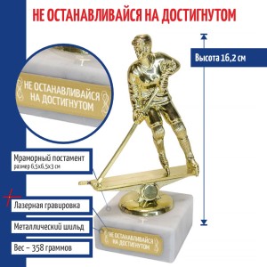 Лазерная гравировка нанесена на табличку (шильд), приклеенную к подставке. Размер: 16,2 x 15 x 9 см. Высота статуэтки без постамента: 13,2 см. Размер мраморной подставки: 6,5 x 6,5 x 3 см. Размер шильдика: 5 x 1,7 см. Материалы: Пластик (фигурка), Мрамор (постамент). Вес: 358 г. Упаковка: Картонная коробка. Наградная фигурка хоккеистки - трофей для турниров, соревнований и спортивных мероприятий. Символ упорства, стойкости и командного духа. Подходит для вручения девушке-спортсменке - нападающему, вратарю, капитану или новичку. Вручение возможно на матч, день рождения, выпускной или в честь победы. Идеально для хоккейных школ, клубов, тренеров и организаторов турниров. Оригинальный подарок на любой праздник или награждение. Он станет достойной памятной наградой за победы и достижения от коллектива на память. Символизирует не только личные успехи, но и благодарность за труд и преданность делу. Актуально в качестве новогоднего сюрприза жене, мужу, отцу, взрослым родственникам (папе, дедушке, маме, бабушке), коллегам (начальнику), преподавателю или юбиляру. Такой красивый сувенир подходит для множества знаковых дат и событий дома и в офисе, на юбилеи родителей, международный женский день (8 марта), 14 и 23 февраля, Новый год или день рождения (ДР). Считается хорошим корпоративным подарком как для мужчин (сыну, брату, другу, любимому парню, руководителю), так и для женщин (начальнице, дочери, сестре, подруге или девушке). Эффектный вариант для хоккеиста - за вклад в команду, к спортивному празднику или по итогам турнира. Подходит спортсмену, нападающему, защитнику, вратарю или форварду - за результативную игру, мастерство владения клюшкой и работу с шайбой. Актуален для игрока-любителя или профессионала - как проявление признания от фанатов или за преданность хоккею, на Всероссийский день хоккея - 1 декабря. 1785