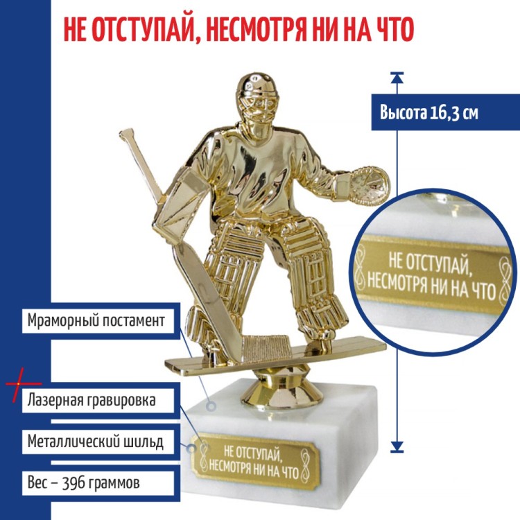 Фигурка вратаря в стойке с хоккейной клюшкой выполнена в наградном формате и устанавливается на каменный постамент с гравировкой. Композиция передаёт динамику спортивного момента и акцентирует внимание на защитной позиции игрока.