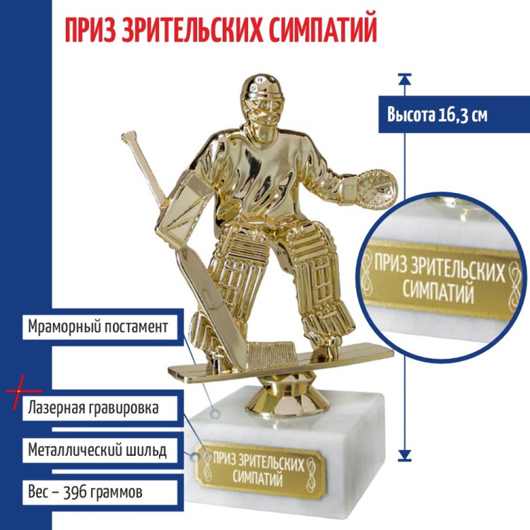 Фигурка вратаря в стойке с хоккейной клюшкой выполнена в наградном формате и устанавливается на каменный постамент с гравировкой. Композиция передаёт динамику спортивного момента и акцентирует внимание на защитной позиции игрока.