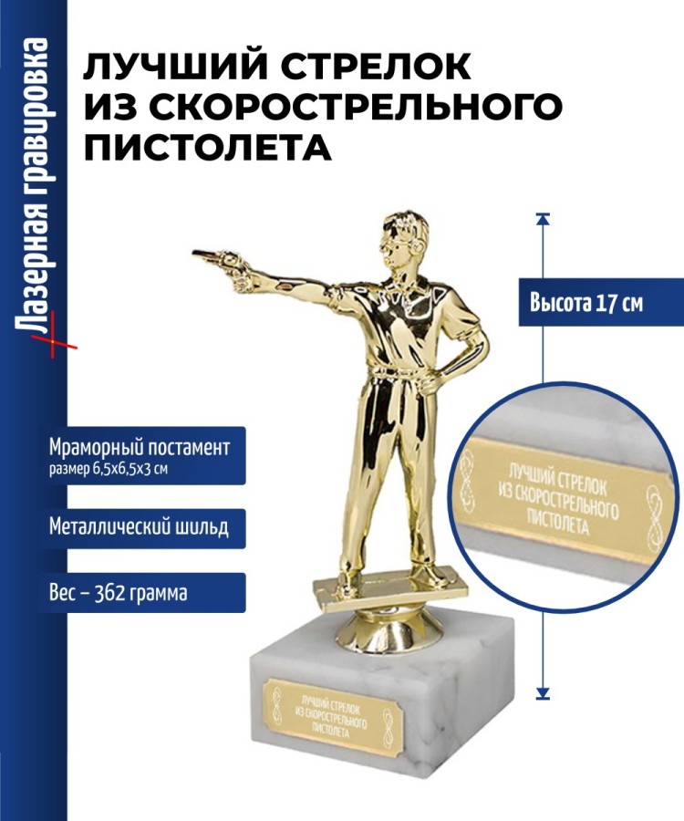 Наградная статуэтка «Пистолетный стрелок» с изображением спортсмена в целевой стойке. Используется для награждения участников соревнований по стрельбе из пистолета, клубных турниров и в качестве памятного приза за достижения в стрелковом спорте.