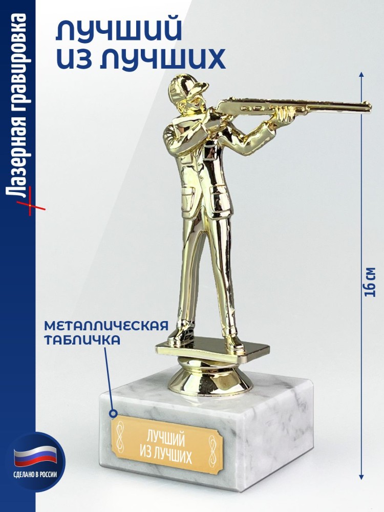 Наградная статуэтка «Стрелок с ружьем» - используется для вручения участникам соревнований, признавая достижения как новичков, так и опытных тренеров и ветеранов.