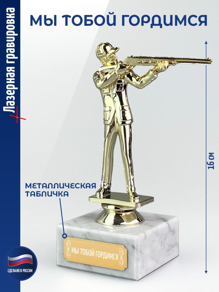 Наградная статуэтка «Стрелок с ружьем» - используется для вручения участникам соревнований, признавая достижения как новичков, так и опытных тренеров и ветеранов.