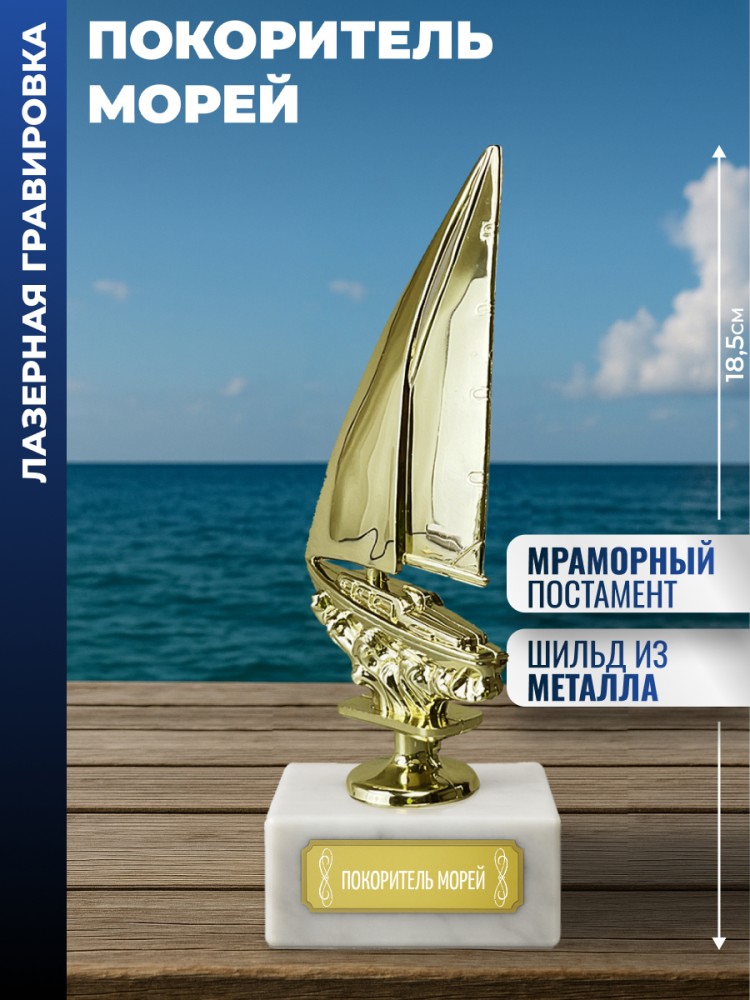 Лазерная гравировка нанесена на табличку (шильд), приклеенную к подставке. Размер: 18,5 x 6,5 x 6,5 см. Высота статуэтки без постамента: 12 см., с постаментом: 18,5 см. Размер постамента: 6,5 x 6,5 x 3 см. Размер шильдика: 5 x 1.7 см. Материал: Пластик (фигурка), Мрамор (подставка). Вес: 360 гр. Наградная статуэтка с фигурой яхты на подставке. Подходит для размещения в интерьерах спортивных залов и коллекциях призовых трофеев. Подарок для настоящего покорителя морских просторов - это признание мастерства лучшего яхтсмена и страсти к парусному спорту. Каждый опытный моряк заслуживает награду за профессионализм на водных акваториях. Человек с морской душой всегда оценит презент, подчеркивающий статус победителя регаты. Сувенир станет отличной памятной наградой за заслуги или победы, подходит для корпоративных и личных подарков на 23 февраля, юбилей, Новый год, день рождения и другие значимые события. Оригинальный подарок для мужчин разного возраста (папе, сыну, брату) или статуса (другу, любимому парню, коллеге от коллектива). Актуально в качестве новогоднего сюрприза мужу, отцу, коллеге, начальнику или юбиляру. Яхтсмен - человек, чья жизнь тесно связана с морем и парусным спортом. Управление яхтой требует навыков, выносливости и глубокого понимания стихии. Такой образ жизни подчёркивает свободу, азарт и преданность морским традициям. Уместен как презент для тех, кто ценит романтику дальних плаваний. 2220