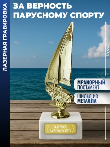 Наградная статуэтка с фигурой яхты на подставке. Подходит для размещения в интерьерах спортивных залов и коллекциях призовых трофеев.