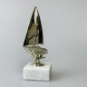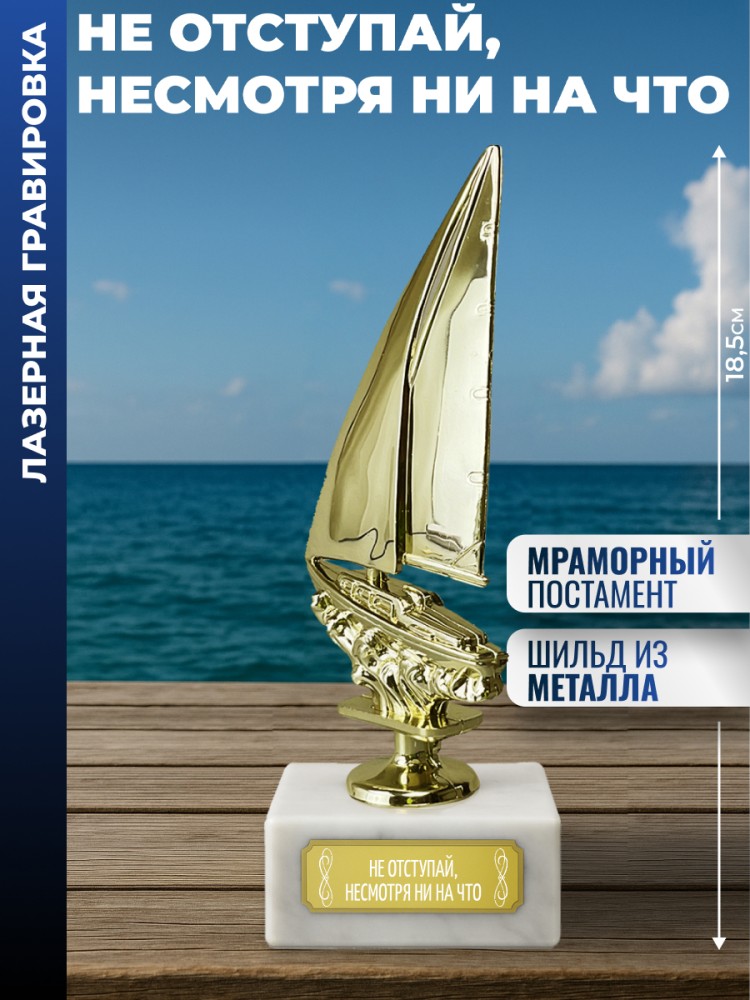 Наградная статуэтка с фигурой яхты на подставке. Подходит для размещения в интерьерах спортивных залов и коллекциях призовых трофеев.