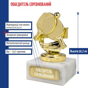 Наградная статуэтка с изображением ракеток и мяча. Используется для вручения участникам и призёрам турниров по настольному теннису, а также для оформления тематических интерьеров.