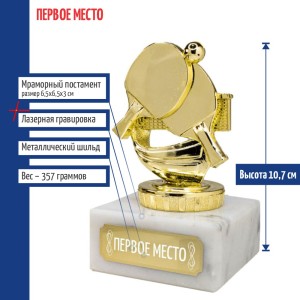 Наградная статуэтка с изображением ракеток и мяча. Используется для вручения участникам и призёрам турниров по настольному теннису, а также для оформления тематических интерьеров.