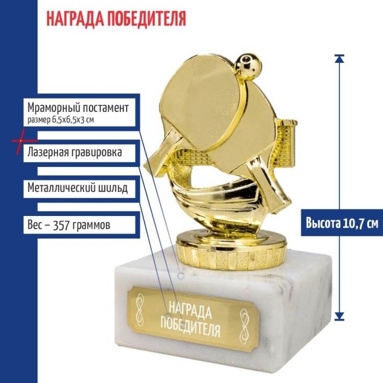 Наградная статуэтка с изображением ракеток и мяча. Используется для вручения участникам и призёрам турниров по настольному теннису, а также для оформления тематических интерьеров.