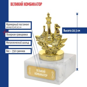 Лазерная гравировка наносится на табличку (шильд), приклеенную к подставке. Размер: 10,5 x 6,5 x 6,5 см. Высота фигурки без постамента: 7,5 см. Размер мраморного постамента: 6,5 x 6,5 x 3 см. Размер шильдика (таблички с надписью): 5 x 1,7 см. Материалы: пластик (фигурка), мрамор (постамент). Вес: 350 гр. Упаковка: картонная коробка. Наградная статуэтка «Шахматы» - подходит для вручения участникам турниров, преподавателям и начинающим шахматистам, а также для оформления тематических интерьеров. Оригинальный подарок на любой праздник или награждение. Он станет достойной памятной наградой за победы и достижения от коллектива на память. Символизирует не только личные успехи, но и благодарность за труд и преданность делу. Актуально в качестве новогоднего сюрприза жене, мужу, отцу, взрослым родственникам (папе, дедушке, маме, бабушке), коллегам (начальнику), преподавателю или юбиляру. Такой красивый сувенир подходит для множества знаковых дат и событий дома и в офисе, на юбилеи родителей, международный женский день (8 марта), 14 и 23 февраля, Новый год или день рождения (ДР). Считается хорошим корпоративным подарком как для мужчин (сыну, брату, другу, любимому парню, руководителю), так и для женщин (начальнице, дочери, сестре, подруге или девушке). Шах и мат - кульминация партии, демонстрирующая стратегическое превосходство. 2199