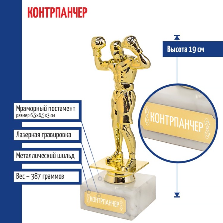Фигурка боксера в перчатках выполнена в наградном формате и размещена на каменном постаменте с гравировкой. Композиция акцентирует внимание на боевом духе, выносливости и стремлении к спортивному результату.