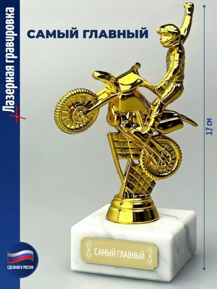 Наградная статуэтка с фигуркой мотоциклиста предназначена для вручения участникам мотосоревнований и мероприятий, связанных с байк-культурой. Используется как трофей за достижения в мотоспорте или тематический элемент коллекции.
