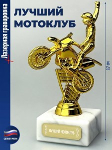 Наградная статуэтка с фигуркой мотоциклиста предназначена для вручения участникам мотосоревнований и мероприятий, связанных с байк-культурой. Используется как трофей за достижения в мотоспорте или тематический элемент коллекции.