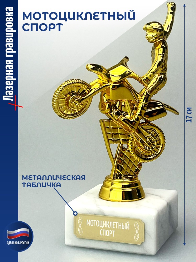 Наградная статуэтка с фигуркой мотоциклиста предназначена для вручения участникам мотосоревнований и мероприятий, связанных с байк-культурой. Используется как трофей за достижения в мотоспорте или тематический элемент коллекции.