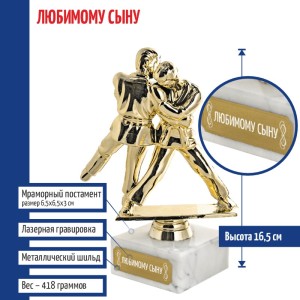 Наградная статуэтка с фигурой дзюдоистов на подставке. Подходит для награждения участников турниров, оформления витрин спортивных клубов и пополнения коллекций тематических трофеев.