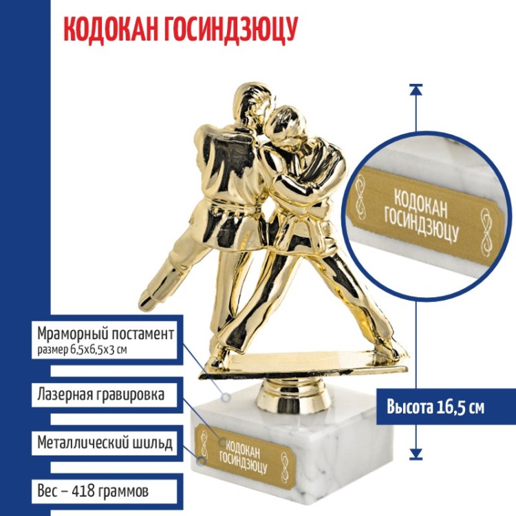 Наградная статуэтка с фигурой дзюдоистов на подставке. Подходит для награждения участников турниров, оформления витрин спортивных клубов и пополнения коллекций тематических трофеев.