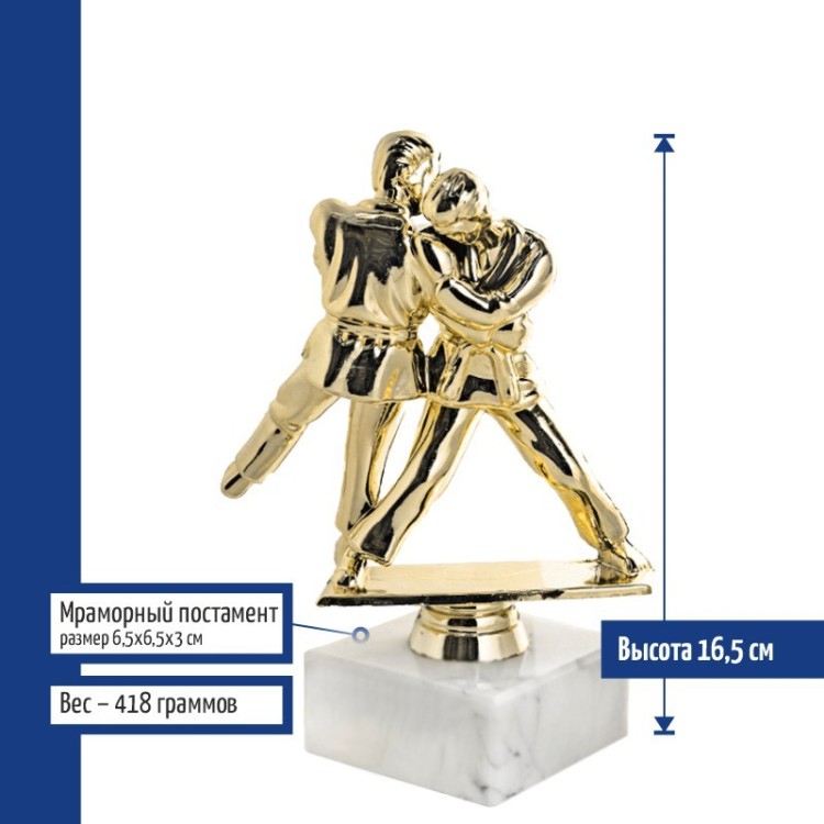 Наградная статуэтка с фигурой дзюдоистов на подставке. Подходит для награждения участников турниров, оформления витрин спортивных клубов и пополнения коллекций тематических трофеев.