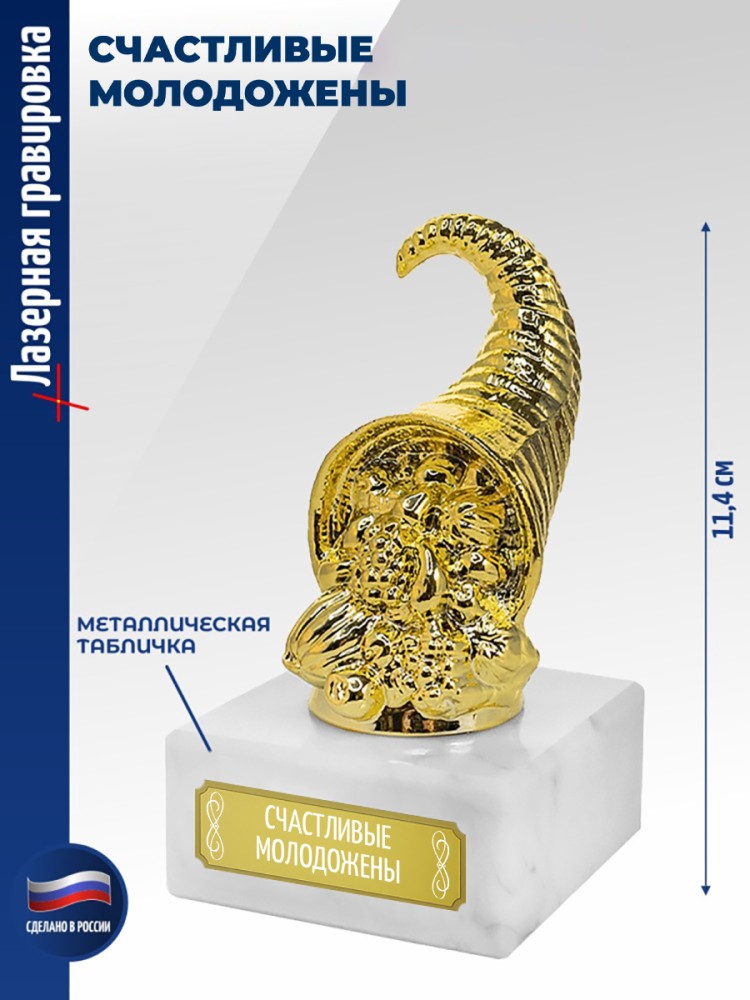 Лазерная гравировка наносится на табличку (шильд), приклеенную к подставке. Размер: 11,4 x 6,5 x 6,5 см. Высота фигурки без постамента: 8,4 см. Размер мраморного постамента: 6,5 x 6,5 x 3 см. Размер шильдика (таблички с надписью): 5 x 1,7 см. Материалы: пластик (фигурка), мрамор (постамент). Вес: 389 гр. Упаковка: картонная коробка. Наградная статуэтка «Рог изобилия» - символ благополучия и семейного счастья. Используется для оформления интерьеров и вручения в качестве сувенира на юбилей, новоселье, годовщину или другую важную дату. Оригинальный подарок на любой праздник или награждение. Он станет достойной памятной наградой за победы и достижения от коллектива на память. Символизирует не только личные успехи, но и благодарность за труд и преданность делу. Актуально в качестве новогоднего сюрприза жене, мужу, отцу, взрослым родственникам (папе, дедушке, маме, бабушке), коллегам (начальнику), преподавателю или юбиляру. Такой красивый сувенир подходит для множества знаковых дат и событий дома и в офисе, на юбилеи родителей, международный женский день (8 марта), 14 и 23 февраля, Новый год или день рождения (ДР). Считается хорошим корпоративным подарком как для мужчин (сыну, брату, другу, любимому парню, руководителю), так и для женщин (начальнице, дочери, сестре, подруге или девушке). 1395