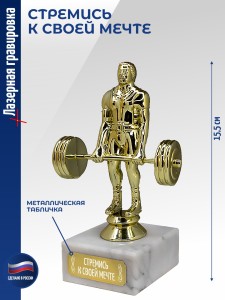 Наградная статуэтка с фигуркой штангиста на мраморной подставке. Подходит для размещения в интерьерах спортивных залов и коллекций спортивных трофеев.