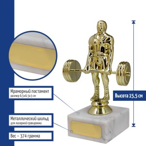 Наградная статуэтка с фигуркой штангиста на мраморной подставке. Подходит для размещения в интерьерах спортивных залов и коллекций спортивных трофеев.