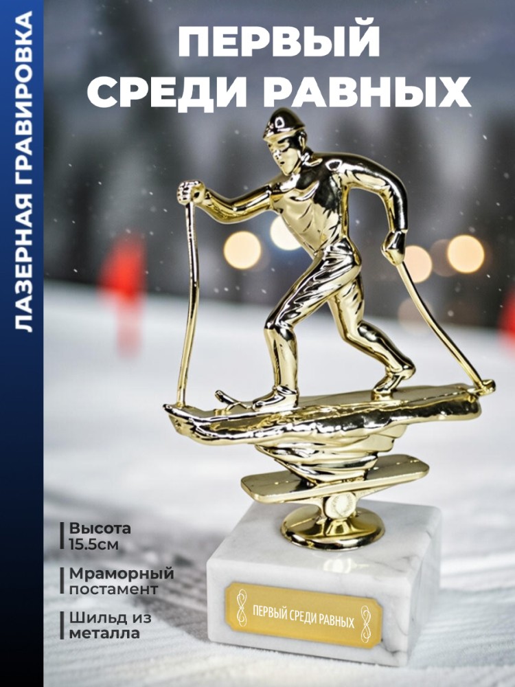 Наградная статуэтка с фигуркой лыжника. Используется для вручения участникам спортивных состязаний по лыжным видам, клубных мероприятий и тематического оформления пространств.