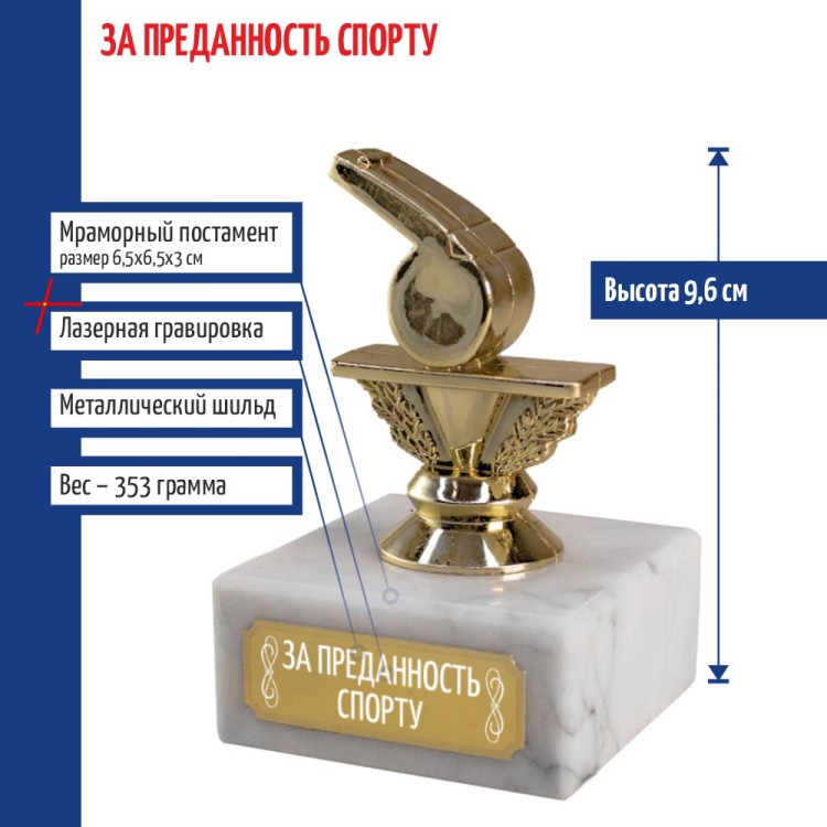 Наградная статуэтка в форме свистка - подходит для награждения судей, тренеров и организаторов соревнований в различных видах спорта.