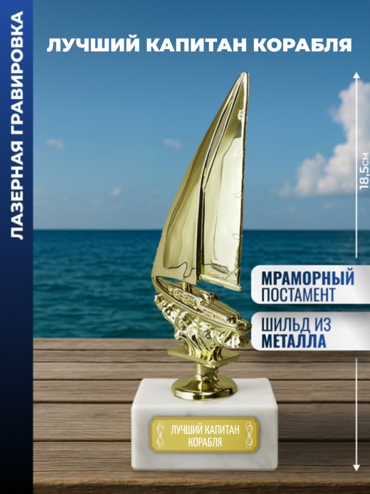 Наградная статуэтка с фигурой яхты на подставке. Подходит для размещения в интерьерах спортивных залов и коллекциях призовых трофеев.