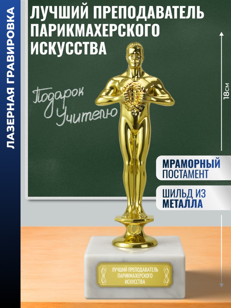 Размер наградной статуэтки: 18 х 6,5 х 6,5 см. Высота фигурки без подставки: 15 см (Материал: пластик). Размер постамента: 6,5 х 6,5 х 3 см (Материал: мрамор). Вес: 400 г. Упаковка: белая картонная коробка. Лазерная гравировка нанесена на металлическую табличку (шильдик: 5 х 1,7 см), приклеенную к мраморному постаменту статуэтки. Наградная фигура используется для награждения призёров на массовых мероприятиях, праздниках или за участие в соревнованиях. Такой кубок будет хорошо смотреться на наградной полке. Сувенир станет отличной памятной наградой за заслуги или победы, подходит для корпоративных и личных подарков на 23 февраля, юбилей, Новый год, день рождения и другие значимые события. Оригинальный подарок для мужчин разного возраста (папе, сыну, брату) или статуса (другу, любимому парню, коллеге от коллектива). Актуально в качестве новогоднего сюрприза мужу, отцу, коллеге, начальнику или юбиляру. Учитель формирует не только знания, но и ценности, раскрывает потенциал и вдохновляет на развитие. Каждый предмет - от математики и ОБЖ до литературы - требует терпения, профессионализма и умения слышать учеников. Учащиеся и родители могут выразить признательность на выпускной, в конце учебного года или ко Дню учителя (5 октября). Особенно важно подчеркнуть индивидуальный подход, будь то классный руководитель или преподаватель английского языка, физики или начальных классов. 2145