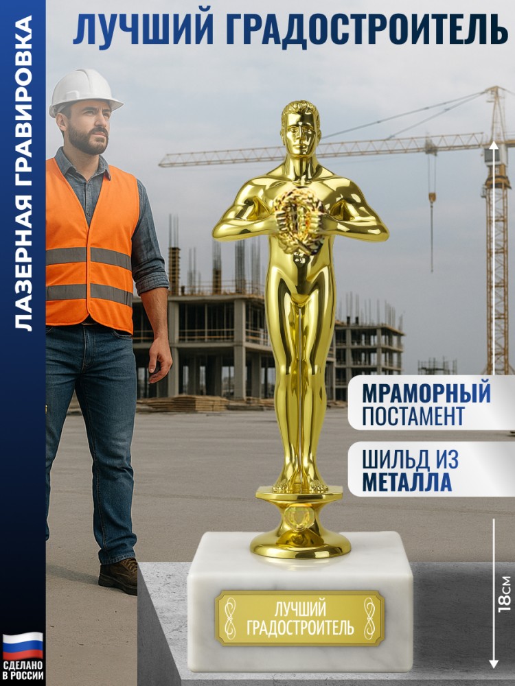 Размер наградной статуэтки: 18 х 6,5 х 6,5 см. Высота фигурки без подставки: 15 см (Материал: пластик). Размер постамента: 6,5 х 6,5 х 3 см (Материал: мрамор). Вес: 400 г. Упаковка: белая картонная коробка. Лазерная гравировка нанесена на металлическую табличку (шильдик: 5 х 1,7 см), приклеенную к мраморному постаменту статуэтки. Наградная фигура используется для награждения призёров на массовых мероприятиях, праздниках или за участие в соревнованиях. Такой кубок будет хорошо смотреться на наградной полке. Сувенир станет отличной памятной наградой за заслуги или победы, подходит для корпоративных и личных подарков на 23 февраля, юбилей, Новый год, день рождения и другие значимые события. Оригинальный подарок для мужчин разного возраста (папе, сыну, брату) или статуса (другу, любимому парню, коллеге от коллектива). Актуально в качестве новогоднего сюрприза мужу, отцу, коллеге, начальнику или юбиляру. Строитель - архитектор прочного фундамента, инженерных решений и городской инфраструктуры. Его работа как плотника или монтажника формирует облик будущего здания. Прораб, каменщик или инженер ценят внимание к деталям и уважение к делу, требующему точности и ответственности. Презент к сдаче объекта или ко Дню строителя (второе воскресенье августа). 2145