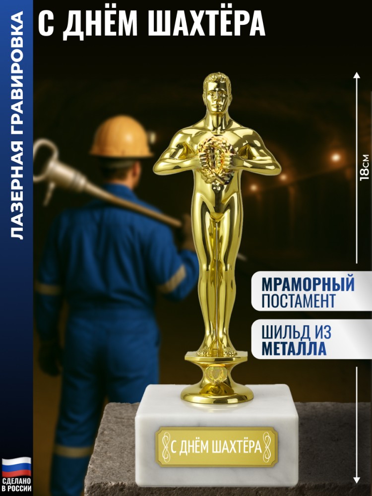 Размер наградной статуэтки: 18 х 6,5 х 6,5 см. Высота фигурки без подставки: 15 см (Материал: пластик). Размер постамента: 6,5 х 6,5 х 3 см (Материал: мрамор). Вес: 400 г. Упаковка: белая картонная коробка. Лазерная гравировка нанесена на металлическую табличку (шильдик: 5 х 1,7 см), приклеенную к мраморному постаменту статуэтки. Наградная фигура используется для награждения призёров на массовых мероприятиях, праздниках или за участие в соревнованиях. Такой кубок будет хорошо смотреться на наградной полке. Оригинальный подарок на любой праздник или награждение. Он станет достойной памятной наградой за победы и достижения от коллектива на память. Символизирует не только личные успехи, но и благодарность за труд и преданность делу. Актуально в качестве новогоднего сюрприза жене, мужу, отцу, взрослым родственникам (папе, дедушке, маме, бабушке), коллегам (начальнику), преподавателю или юбиляру. Такой красивый сувенир подходит для множества знаковых дат и событий дома и в офисе, на юбилеи родителей, международный женский день (8 марта), 14 и 23 февраля, Новый год или день рождения (ДР). Считается хорошим корпоративным подарком как для мужчин (сыну, брату, другу, любимому парню, руководителю), так и для женщин (начальнице, дочери, сестре, подруге или девушке). Памятный вариант для горняка, горнорабочего, угольщика и рудокопа - ко Дню шахтёра (28 августа) или за заслуги на руднике. Подходит горному инженеру и добытчику - в честь мастерства забойщика и проходчика при присвоении звания, завершении проекта или повышении квалификации. 2145