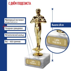 Размер наградной статуэтки: 18 х 6,5 х 6,5 см. Высота фигурки без подставки: 15 см (Материал: пластик). Размер постамента: 6,5 х 6,5 х 3 см (Материал: мрамор). Вес: 400 г. Упаковка: белая картонная коробка. Лазерная гравировка нанесена на металлическую табличку (шильдик: 5 х 1,7 см), приклеенную к мраморному постаменту статуэтки. Наградная фигура используется для награждения призёров на массовых мероприятиях, праздниках или за участие в соревнованиях. Такой кубок будет хорошо смотреться на наградной полке. Сувенир станет отличной памятной наградой за заслуги или победы, подходит для корпоративных и личных подарков на 23 февраля, юбилей, Новый год, день рождения и другие значимые события. Оригинальный подарок для мужчин разного возраста (папе, сыну, брату) или статуса (другу, любимому парню, коллеге от коллектива). Актуально в качестве новогоднего сюрприза мужу, отцу, коллеге, начальнику или юбиляру. 2145