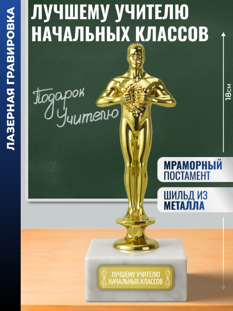 Размер наградной статуэтки: 18 х 6,5 х 6,5 см. Высота фигурки без подставки: 15 см (Материал: пластик). Размер постамента: 6,5 х 6,5 х 3 см (Материал: мрамор). Вес: 400 г. Упаковка: белая картонная коробка. Лазерная гравировка нанесена на металлическую табличку (шильдик: 5 х 1,7 см), приклеенную к мраморному постаменту. Это отличный подарок для близких и родных, который можно вручить с торжественностью, будто это кинопремия оскар или как на другом массовом событии. Зёздная фигурка достаётся настоящему победителю. Наградная фигура окажется эффектным подарком на день рождения или другие торжественные мероприятия, подчёркивая гордость обладателя. Приятный и недорогой сувенир для полки с кубками дома или трофеями в офисном помещении. Идеальный подарок учителю любого уровня образования - от педагога начальных классов до преподавателя старшеклассников. Порадует классного руководителя, наставника и учительницу (в школе или учебном заведении). Особенный выбор для важных школьных событий: выпускной, последний звонок, 1 сентября или День учителя (5 октября). Подойдет для выражения благодарности от выпускника училища, ученика школы или целого класса и их родителей (родительский комитет). Универсальное решение для признания заслуг в образовании и обучении. Оценят как опытный педагог или репетитор с многолетним стажем, так и молодой преподаватель-наставник, работающий с младшеклассниками. Станет памятным презентом для всех, кто связан с передачей знаний и воспитанием. Поможет выразить искреннюю признательность любимой учительнице - от благодарных учеников до коллег. Красивый способ отметить вклад лучшего педагога в школьный праздник или учебный процесс техникума, в том числе и в гимназии, академии, колледже или лицее. 2145