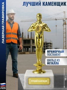 Лазерная гравировка нанесена на металлическую табличку (шильдик: 5 х 1,7 см), приклеенную к мраморному постаменту статуэтки.