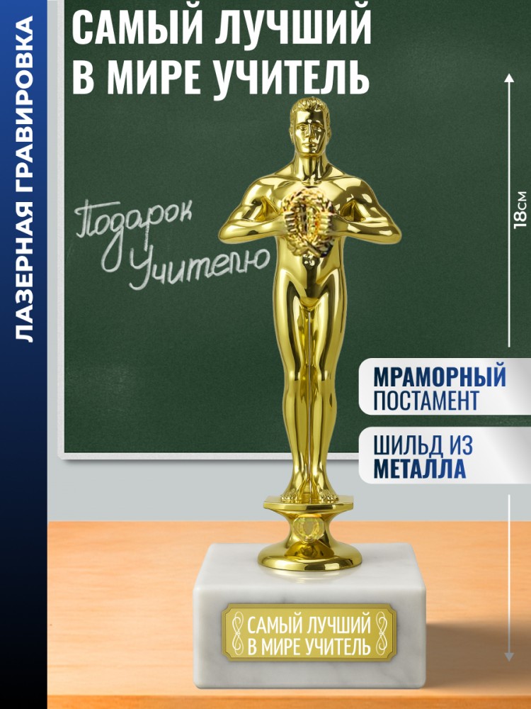 Размер наградной статуэтки: 18 х 6,5 х 6,5 см. Высота фигурки без подставки: 15 см (Материал: пластик). Размер постамента: 6,5 х 6,5 х 3 см (Материал: мрамор). Вес: 400 г. Упаковка: белая картонная коробка. Лазерная гравировка нанесена на металлическую табличку (шильдик: 5 х 1,7 см), приклеенную к мраморному постаменту. Это отличный подарок для близких и родных, который можно вручить с торжественностью, будто это кинопремия оскар или как на другом массовом событии. Зёздная фигурка достаётся настоящему победителю. Наградная фигура окажется эффектным подарком на день рождения или другие торжественные мероприятия, подчёркивая гордость обладателя. Приятный и недорогой сувенир для полки с кубками дома или трофеями в офисном помещении. Идеальный подарок учителю любого уровня образования - от педагога начальных классов до преподавателя старшеклассников. Порадует классного руководителя, наставника и учительницу (в школе или учебном заведении). Особенный выбор для важных школьных событий: выпускной, последний звонок, 1 сентября или День учителя (5 октября). Подойдет для выражения благодарности от выпускника училища, ученика школы или целого класса и их родителей (родительский комитет). Универсальное решение для признания заслуг в образовании и обучении. Оценят как опытный педагог или репетитор с многолетним стажем, так и молодой преподаватель-наставник, работающий с младшеклассниками. Станет памятным презентом для всех, кто связан с передачей знаний и воспитанием. Поможет выразить искреннюю признательность любимой учительнице - от благодарных учеников до коллег. Красивый способ отметить вклад лучшего педагога в школьный праздник или учебный процесс техникума, в том числе и в гимназии, академии, колледже или лицее. 2145