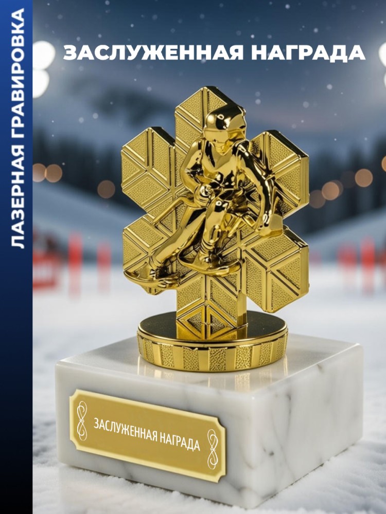 Наградная статуэтка с изображением лыжника в динамике скоростного спуска. Используется для вручения участникам лыжных соревнований, клубных мероприятий и оформления спортивных интерьеров.