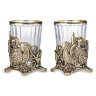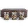 Набор из трёх стопок с изображением древнерусских витязей, выполненный из латуни и стекла, в футляре из искусственной кожи, отличается высоким качеством и стилем.