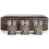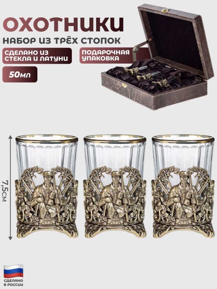 Элегантный набор из трех стопок "Охотники", выполненный из стекла и латуни, упакованный в футляр из искусственной кожи, станет достойным дополнением к коллекции каждого ценителя.