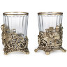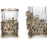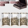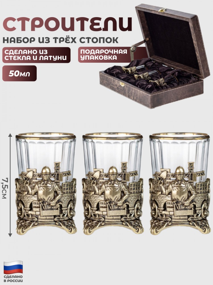 Уникальный набор из трех стопок "Строители", выполненный из стекла и латуни и представленный в футляре из искусственной кожи, подчеркнет вкус и статус его обладателя.