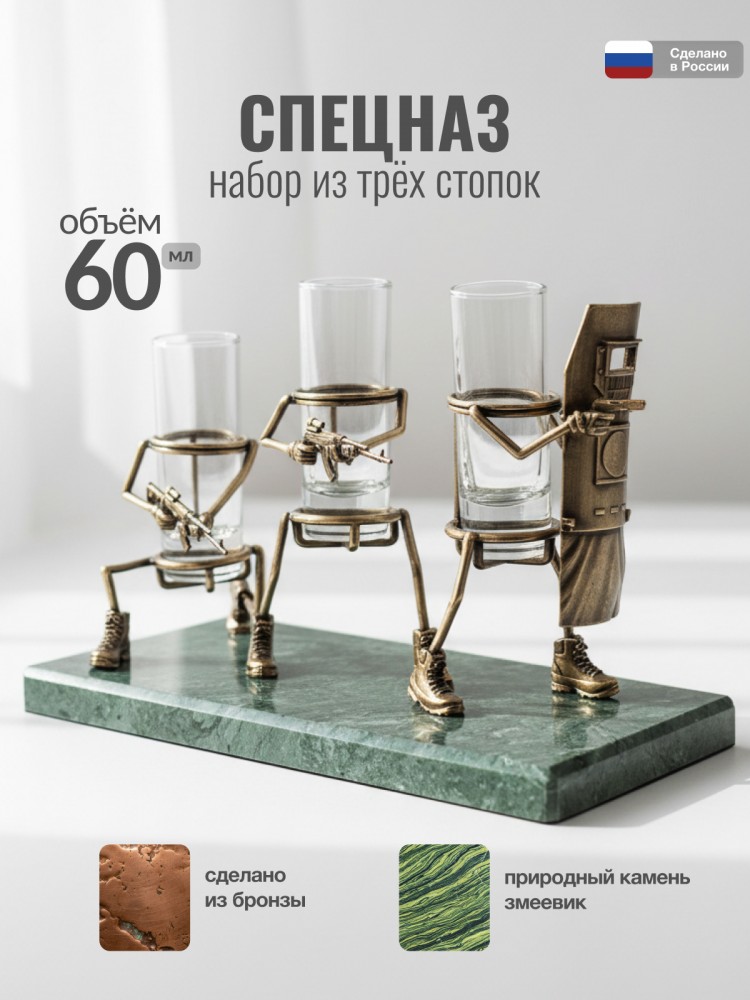 Эксклюзивный набор стопок с элементами спецназа, выполненных из стекла, бронзы и змеевика.