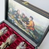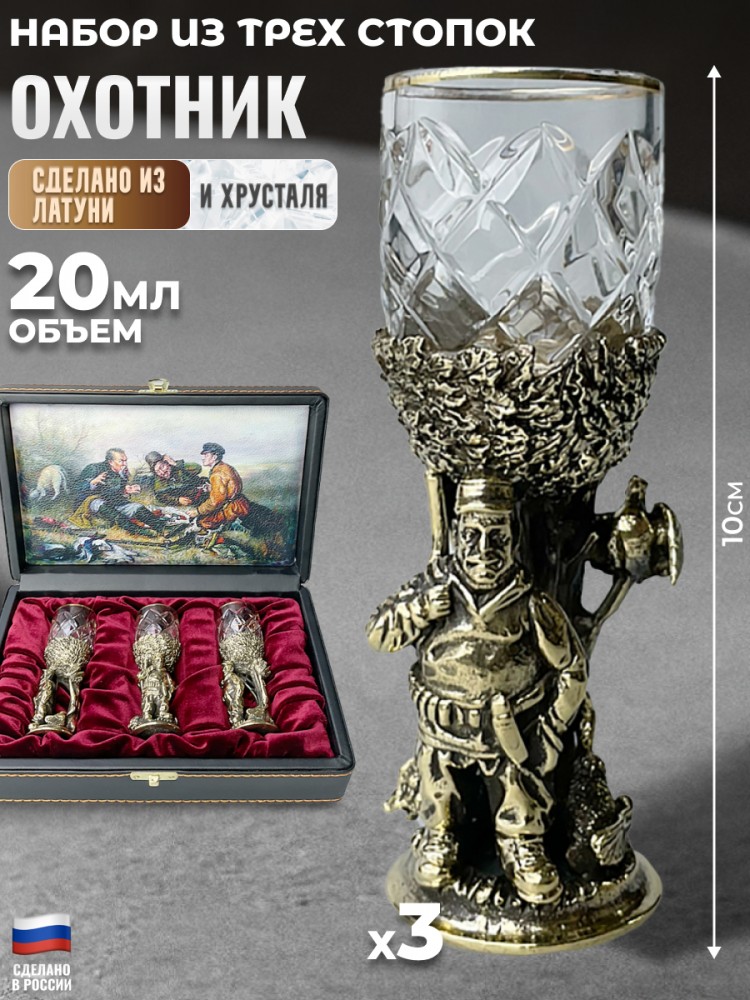 Элегантный набор из трех стопок "Охотники", выполненный из стекла и латуни, упакованный в футляр из искусственной кожи, станет достойным дополнением к коллекции каждого ценителя.