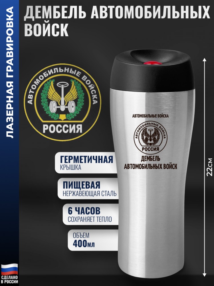 Сохранение тепла до: 6 ч., холода до: 8 ч. Материал корпуса и колбы термо стакана: Нержавеющая сталь. Герметичная крышка: Да (непроливайка, с нажимным клапаном - кнопкой для питья). Вакуумные стенки (двойная колба): Да (долго держит тепло напитков). Объём автокружки: 400 мл. Гравировка нанесена с одной стороны металлической термокружки. Размер: 22 x 8 x 8 см. Материал крышки: Пластик. Благодаря стильному дизайну и высококачественной стали, автомобильный термостакан для кофе или горячего чая долго сохраняет тепло и холод, будто небольшой туристический термос, что делает его подходящим вариантом для любого образа жизни. Подарочная термо кружка с надписью станет отличным спутником в машине (для автомобиля), дома или офисе. Актуально как оригинальный подарок с нанесенным логотипом от коллектива, либо в качестве сюрприза с принтом для друзей, а также на праздники близких людей. Автомобильные войска - важная составляющая современных вооружённых сил, обеспечивающая мобильность и логистику. 4395