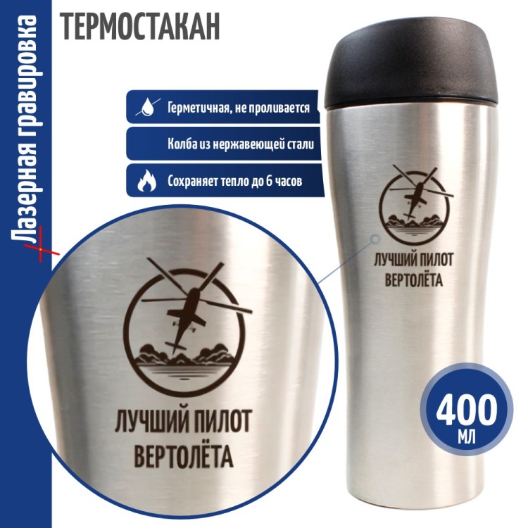 Сохранение тепла до: 6 ч., холода до: 8 ч. Материал корпуса и колбы термо стакана: Нержавеющая сталь. Герметичная крышка: Да (непроливайка, с нажимным клапаном - кнопкой для питья). Вакуумные стенки (двойная колба): Да (долго держит тепло напитков). Объём автокружки: 400 мл. Гравировка нанесена с одной стороны металлической термокружки. Размер: 22 x 8 x 8 см. Материал крышки: Пластик. Благодаря стильному дизайну и высококачественной стали, автомобильный термостакан для кофе или горячего чая долго сохраняет тепло и холод, будто небольшой туристический термос, что делает его подходящим вариантом для любого образа жизни. Такая термо кружка станет отличным спутником в машине, дома или офисе. Лётчик вертолёта - профессия, требующая мастерства и точности. Управление винтокрылой машиной подразумевает ответственность и высокую квалификацию. Лучший лётчик вертолёта демонстрирует не только технические навыки, но и хладнокровие в сложных ситуациях. Такой специалист ценится в гражданской и военной авиации. 4395