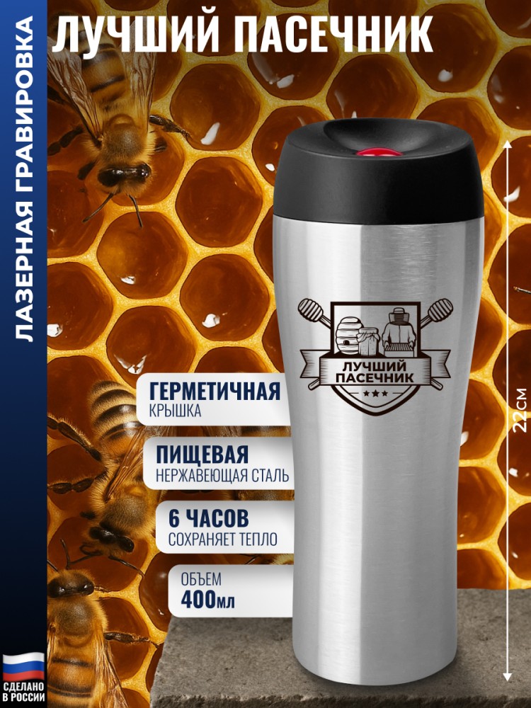 Гравировка нанесена с одной стороны металлической термокружки.