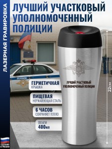 Гравировка нанесена с одной стороны металлической термокружки.