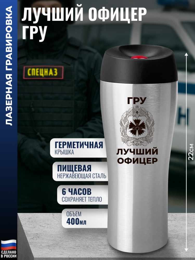 Гравировка нанесена с одной стороны металлической термокружки.