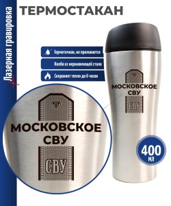 Гравировка нанесена с одной стороны металлической термокружки.