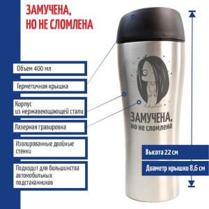 Подарочная термо кружка с надписью станет отличным спутником в машине (для автомобиля), дома или офисе. Актуально как оригинальный подарок с нанесенным логотипом от коллектива, либо в качестве сюрприза с принтом для друзей, а также на праздники близких людей.